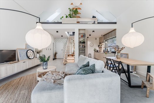 Dom o powierzchni użytkowej 102,28 m2 składa się z: salonu połączonego z jadalnią, z wyjściem na przestronny taras, otwartej kuchni, dwóch pokoi, łazienki w trakcie realizacji, korytarza, pomieszczenia gospodarczego oraz antresoli, na której znajduje się wydzielona garderoba oraz toaleta, która również jest w trakcie realizacji. W łazience prysznic. Nieruchomość doświetlona od strony zachodniej, wschodniej oraz północnej. Okna PCV trzyszybowe. Drzwi antywłamaniowe. Wyposażenie: lodówka, pralka, piekarnik dual cook, płyta indukcyjna Elica Nikola Tesla. Wyprowadzone zostały dwa przyłącza pod zabudowę zmywarki.