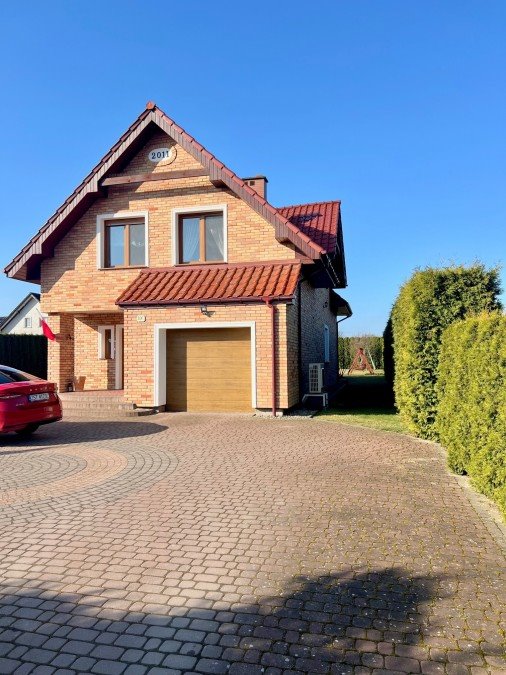 Dom został wykończony z dbałością o detale – elewację stanowi elegancka cegła cementowa cięta i impregnowana, a dach pokryty jest trwałą dachówką ceramiczną. Budynek jest bardzo dobrze ocieplony (20 cm styropianu), co przekłada się na niskie koszty utrzymania.