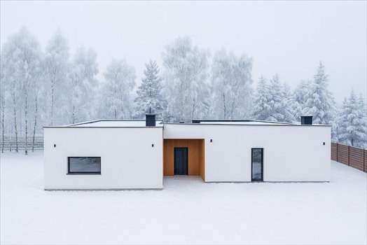 Projekt domu to nowoczesna, minimalistyczna forma, parterowy budynek wyróżnia się proporcjonalną, geometryczną bryłą.