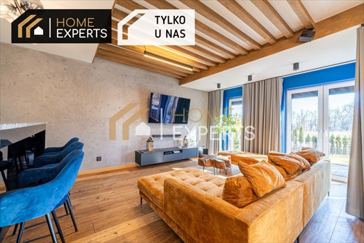 Salon od południowego zachodu z dużymi oknami, wyjściem na wygody taras i widokiem na zieleń. Na podłodze w salonie trwała i ponad czasowa deska dębowa a pod sufitem drewniane lamele ocieplające klimat wykończenia. W pokoju dzienny znajduje się wygodny, rodziny zestaw wypoczynkowy i 6 osobowy stół jadalniany.