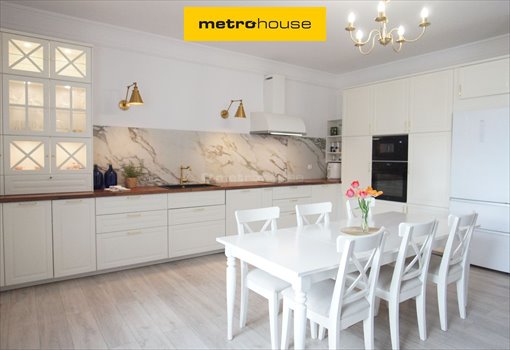 Kuchnia wyróżnia się eleganckimi białymi szafkami, drewnianym blatem i marmurowym panelem ściennym. Wysokiej klasy urządzenia i złote oprawy dodają odrobinę luksusu. Jadalnia, sąsiadująca z kuchnią, oferuje jasną i przestronną przestrzeń do posiłków.