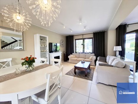 Parter domu to wiatrołap z możliwością zabudowania szafy, toaleta w kolorystyce bieli i drewna idealnie komponuje się z pozostałymi pomieszczeniami na parterze, kuchnia z białymi klasycznymi meblami wykonanymi pod indywidualne zamówienie, wyposażona w niezbędny sprzęt AGD, jadalnia z owalnym drewnianym stołem i krzesłami, salon z bio-kominkiem oraz taras z wyjściem bezpośrednio do dużego ogrodu który zapewnia nam relaks przy szumie drzew. Nie powtarzalnego klimatu dodają precyzyjnie dobrane dodatki które idealnie komponują się z całym domem. Na piętro domu poprowadzą nas dębowe schody. Na górze znajdziemy trzy niezależne sypialnie w tym jedna z garderobą. Łazienka która znajduje się na piętrze jest bardzo przestronna znajdują się w niej dwie umywalki, prysznic a wolnostojąca wanna na pięknych posrebrzanych nóżkach dopełnia jej całość.