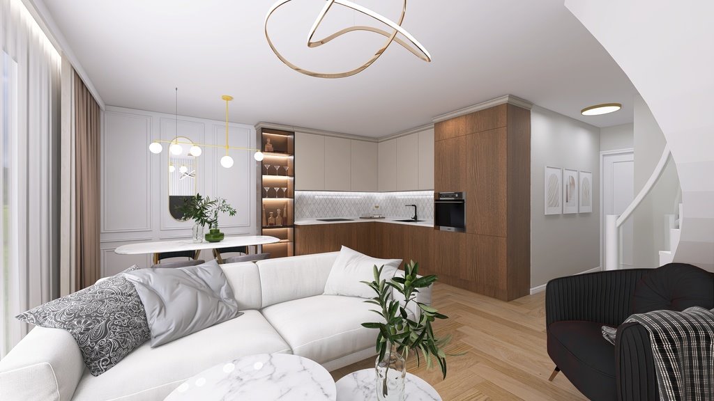 Przestronny, dwupoziomowy lokal mieszkalny o powierzchni 108,65 m² mieści się w nowoczesnym domu w zabudowie szeregowej.