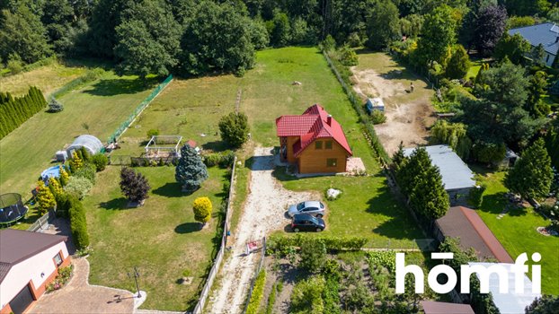 A large, green plot with an area of up to 2,200 m2 with an entrance gate, fenced, developed with a single-family residential building constructed at the turn of 2023 and 2024.
