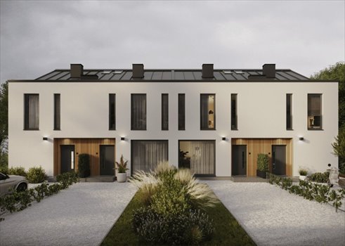 Budynek wyróżnia się estetyczną formą - jasne elewacje przełamane naturalnym drewnem nadają mu nowoczesny, ciepły charakter. To idealna propozycja dla osób szukających funkcjonalnego i harmonijnie zaprojektowanego domu.
