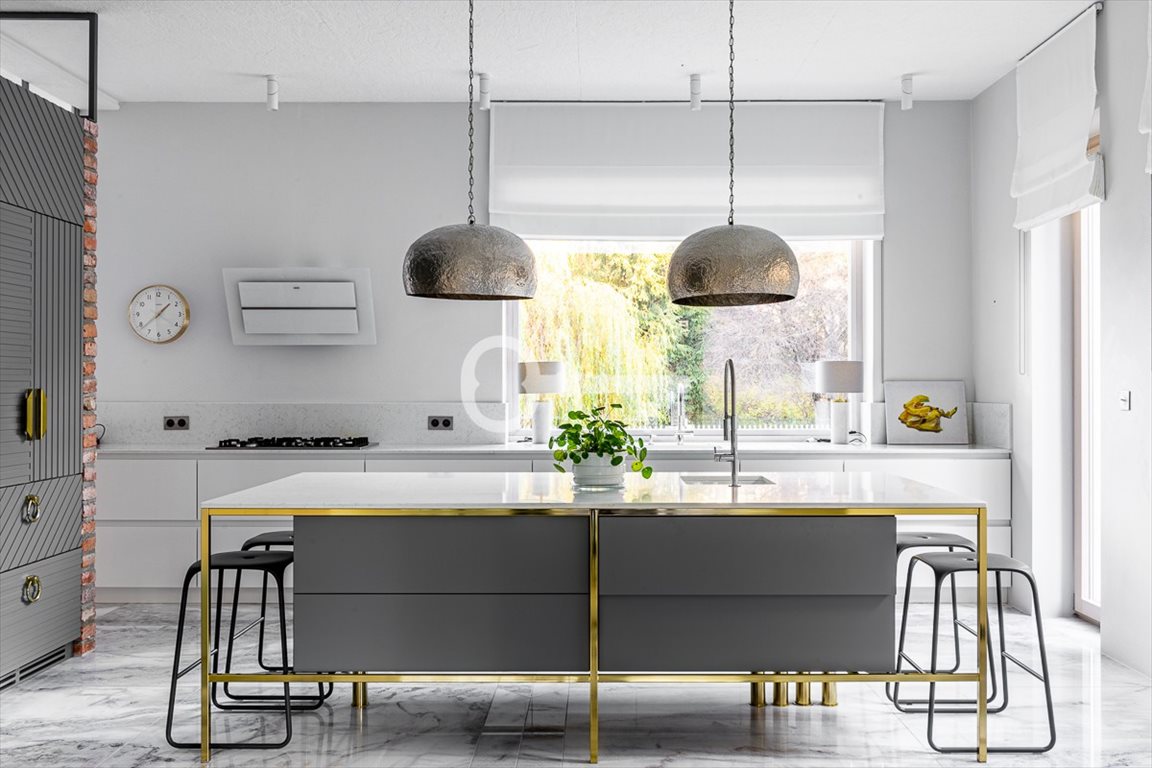 Nowoczesna zabudowa kuchni, z biżuteryjnymi dodatkami w kolorze złota, industrialne elementy wykończenia stropu oraz ściana z surowej cegły (ocalona z oryginalnego budynku) to tylko niektóre elementy podkreślające indywidualny charakter rezydencji.