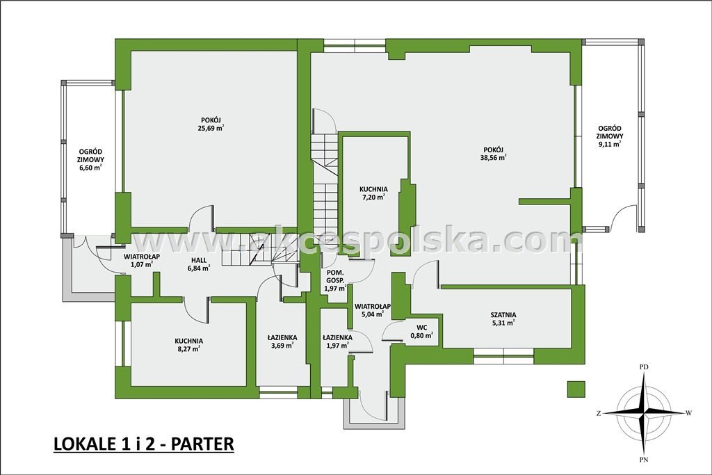 Parter - pokój 38,5 m2; kuchnia 7 m2; łazienka; WC; hol; szatnia; po. gospodarcze; wiatrołap, ogród zimowy.