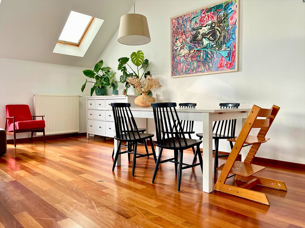 Nieruchomość oferuje duże możliwości aranżacyjne. Sercem domu jest przestronna część dzienna z kominkiem, z której prowadzi wyjście na taras i skrajny, prywatny ogród o powierzchni ok. 340 m². To idealne miejsce do relaksu, spotkań rodzinnych i odpoczynku po intensywnym dniu. Jadalnia płynnie łączy się z kuchnią, tworząc wygodną i jasną przestrzeń do codziennego życia.