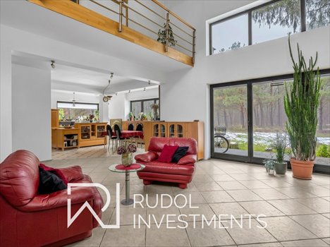 Nieruchomość wyróżnia się nietypową, nowoczesną bryłą oraz imponującą wysokością pomieszczeń. Dom został zaprojektowany specjalnie dla właścicielki-malarki: wysokie sufity i liczne, długie ściany powstały po to, by mogła swobodnie tworzyć i eksponować swoje obrazy. Budynek zyskał świeży wygląd dzięki niedawnemu odmalowaniu elewacji, natomiast otaczający go teren pozostaje naturalny i niezagospodarowany, stanowiąc fragment spokojnego, prywatnego lasu.