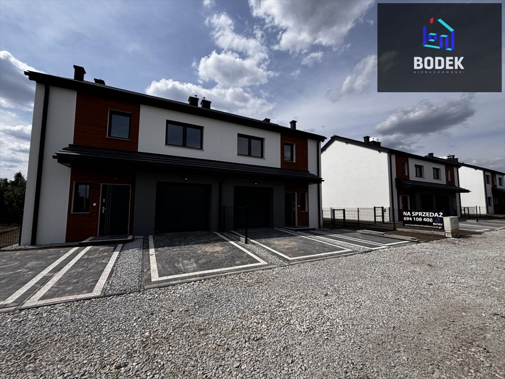 Teren wokół budynku ogrodzony, wykonane podjazdy i chodniki oraz kompletne wykończenie budynków z zewnątrz. Garaż plus dodatkowe dwa miejsca parkingowe przed domem. Podwójna ściana między budynkami z dylatacją ze styropianu.