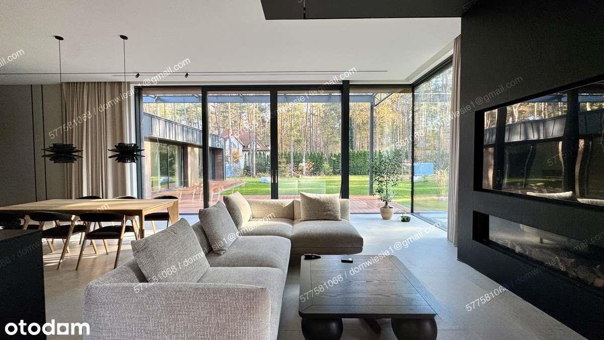 For sale: an exceptional, modern, newly finished one-storey house located in a forested area with fast access to Warsaw (approx. 15 minutes via the S8 route). The property stands out thanks to its bespoke architectural design and outstanding workmanship using distinctive, high-quality finishing materials.