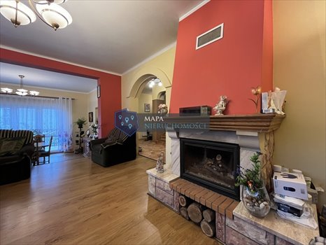 W salonie klimatyczny kominek. Kuchnia z meblami w zabudowie w klasycznym stylu.