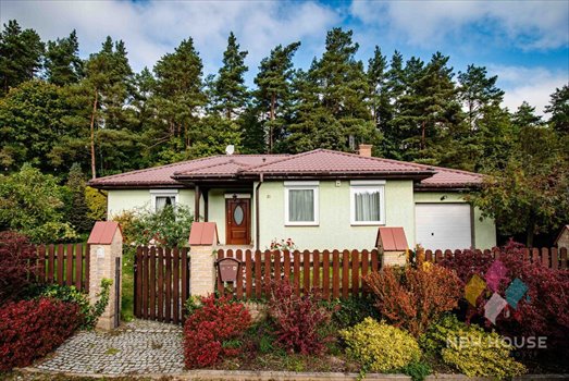 Parterowy, funkcjonalny dom bezpośrednio graniczący ze ścianą lasu, położony w spokojnym sąsiedztwie.