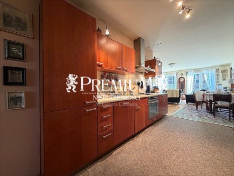 W kuchni - zabudowa meblami na wymiar wraz ze sprzętami AGD - płyta indukcyjna, piekarnik, zmywarka, chłodziarko-zamrażarka, okap