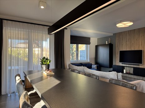 Z zewnątrz bryła domu prezentuje się czysto i spokojnie ale po przekroczeniu progu wita Cię niepowtarzalny styl oraz otwarta, płynna przestrzeń dzienna. Salon i kuchnia to jedno serce domu: salon z dwiema wygodnymi sofami i stolikiem kawowym oraz ściana medialna, kuchnia i jej długa wyspa pełniąca rolę stołu, idealnego na przyjęcia w gronie przyjaciół, matowe czarne fronty dodające charakteru, ciepłe światło stwarza przytulny klimat i widok na taras, gdzie letnie wieczory w otoczeniu ogrodu spędzisz w atmosferze relaksu.