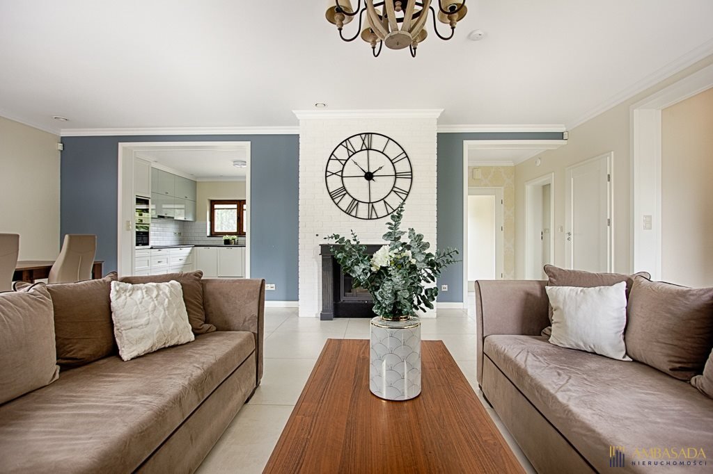 Wnętrza wykończone w wysokim standardzie i funkcjonalnym stylu. Na podłogach gres oraz drewniane deski, schody wykonane przez stolarza również drewniane, kamienne parapety, okna wyposażone w moskitiery, rekuperacja . Kompleksowa instalacja ogrzewania podłogowego na dwóch kondygnacjach, automatyczny system nawadniania ogrodu, gruntowa pompa ciepła , tradycyjny kominek z miejscowym rozprowadzeniem ciepła, system alarmowy z zewnętrznym monitoringiem.