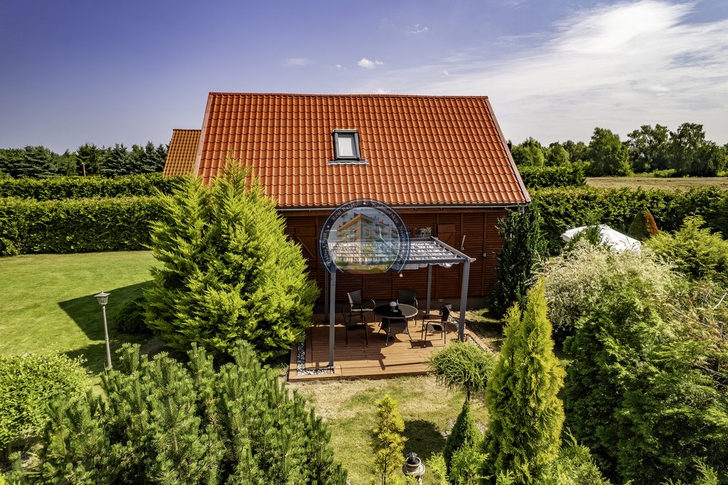 Ten pierwszy dla właścicieli powstał w 2011 roku, 90 metrów pięknej drewnianej przestrzeni. Na parterze dwa tarasy, jeden przy wejściu, drugi za domem, kuchnia z przytulnym salonem z kominkiem i łazienką, a na piętrze kolejna toaleta, spory korytarz i dwie sypialnie z czego jedna ma duży balkon, abyś wieczorami mógł przy drinku podziwiać przepiękne zachody słońca.