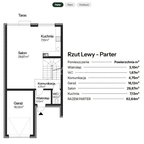 - parter z przestronną strefą dzienną: salon, jadalnia, kuchnia, wyjście na ogród