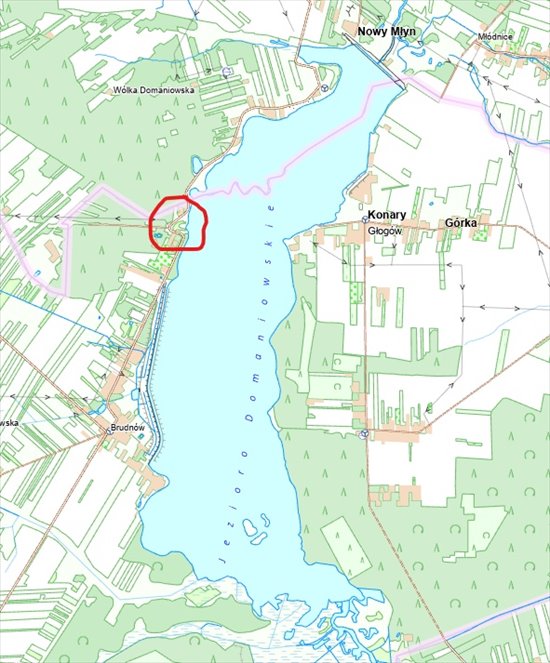 Do sprzedania działka budowlana (nr 126/4; 126/5; 127/4; 127/5) w miejscowości Brudnów nad zalewem w Domaniowie w kształcie trapezu.
