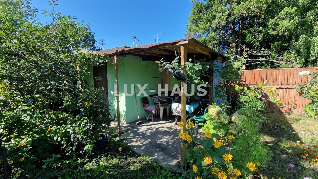 Działka w kształcie prostokąta, wiele nasadzeń, mały domek - około 15 m2 w skład którego wchodzi pokój i mała kuchnia, zadaszony taras. Toaleta na zewnątrz.