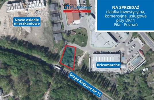 Na sprzedaż działka inwestycyjna zlokalizowana w Chodzieży bezpośrednio przy drodze krajowej nr 11 kierunek Piła -Poznań. Działka jest objęta miejscowym planem zagospodarowania przestrzennego jako 2U - tereny zabudowy usługowej . Możliwe do wybudowania budynki usługowe, w tym budynki handlowe o powierzchni do 750 m 2 . Bardzo dobra lokalizacja, ze względu na pobliskie nowo powstające osiedle mieszkaniowe oraz ciąg pieszo-rowerowy idący wzdłuż działki z drogi krajowej (11) do drogi wojewódzkiej (193). Wjazd do działki z drogi dwustronny: szerokość ok. 22 m.