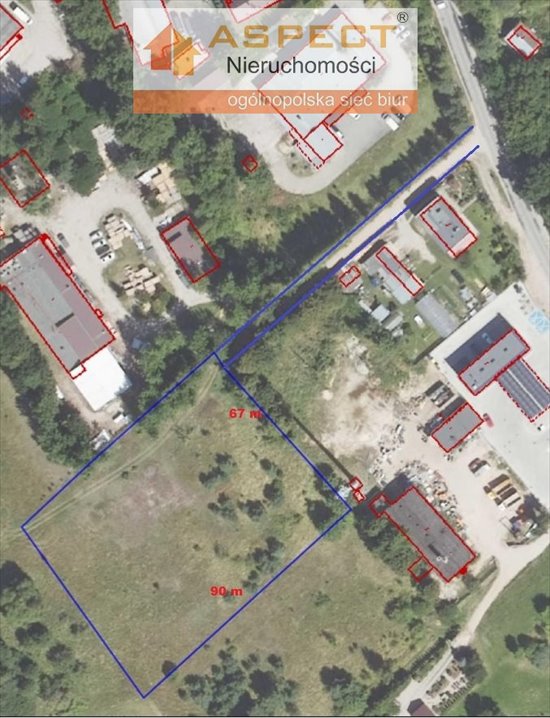 Działka ma kształt prostokąta, szerokość od ulicy: ok. 67 m, długość: ok. 90 m.