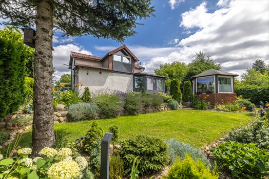 Na działce znajdują się nasadzenia m.in. sosna, krzewy owocowe i kwiaty.