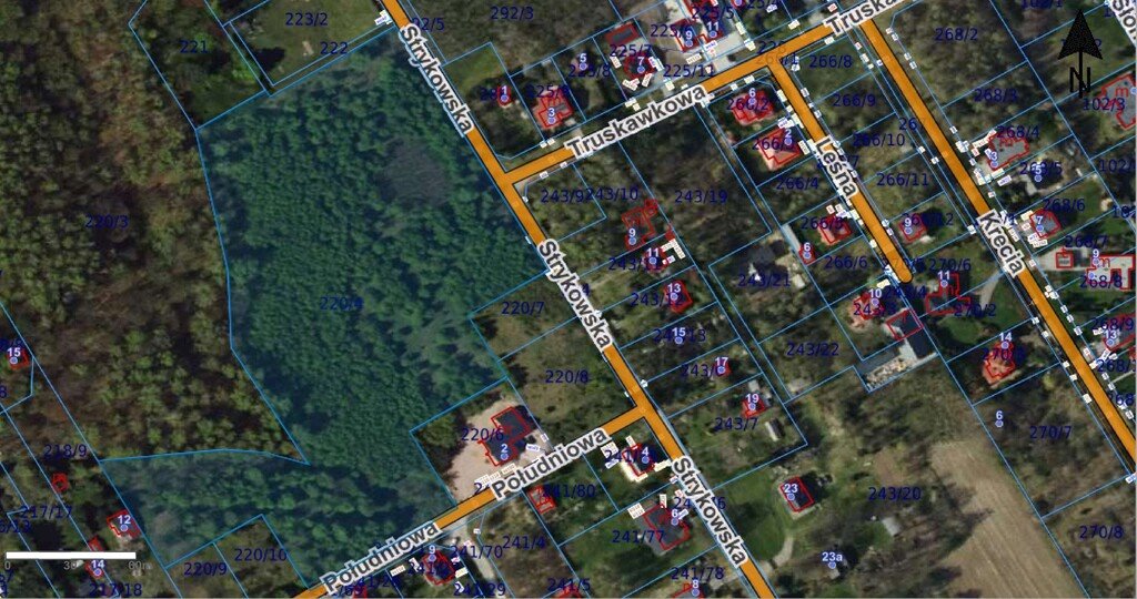 - Wjazd z ul. Strykowskiej (asfalt), ul. Wypoczynkowej (gruntowa) lub przez działkę 220/4,