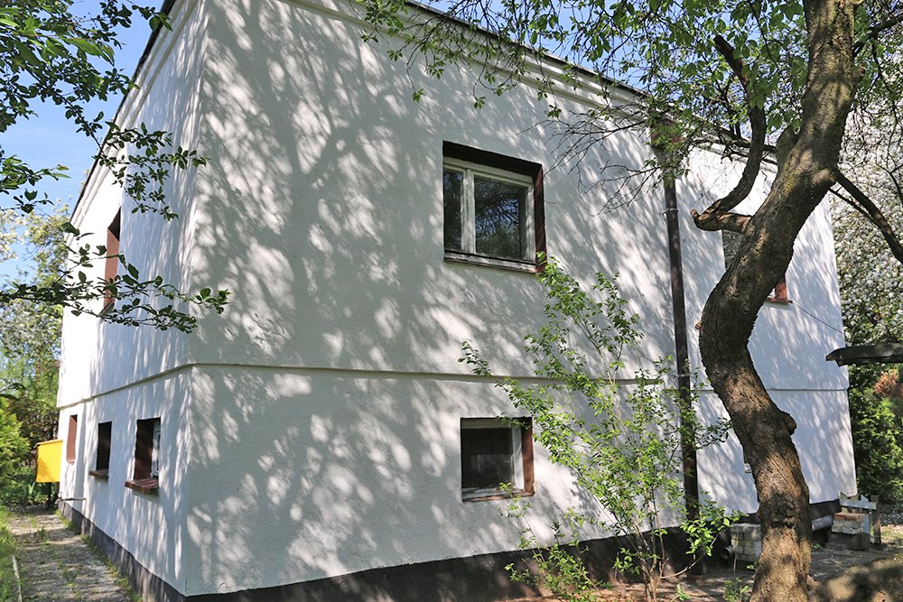 - Zieleń na działce: drzewa i krzewy owocowe – jabłoń, grusza, śliwa, wiśnia, orzechy (laskowy i włoski), porzeczki, agrest oraz tuje.