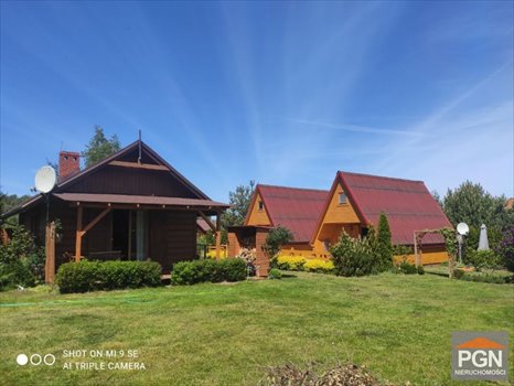 Działka ogrodzona, o regularnym kształcie zabudowana domem drewnianym z pomieszczeniem sauny oraz posadowionymi na betonowym podeście 2 domkami drewnianymi typu Brda.