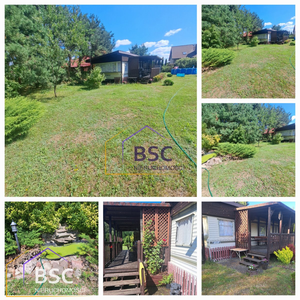 Cały teren jest ogrodzony siatką, a zasadzenia drzew, krzewów i tui stanowi przyjemne uzupełnienie całości. Na działce posadowiony jest domek kanadyjski (przyczepa) z przyjemną werandą.