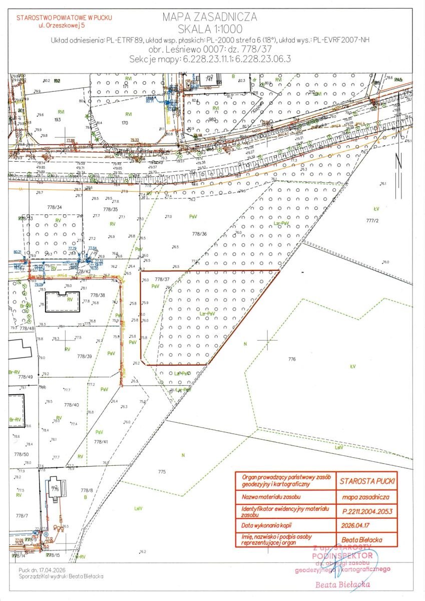 Oferuję na sprzedaż działkę nr 778/37 o pow. 2369m2 w miejscowości Leśniewo k/Pucka.