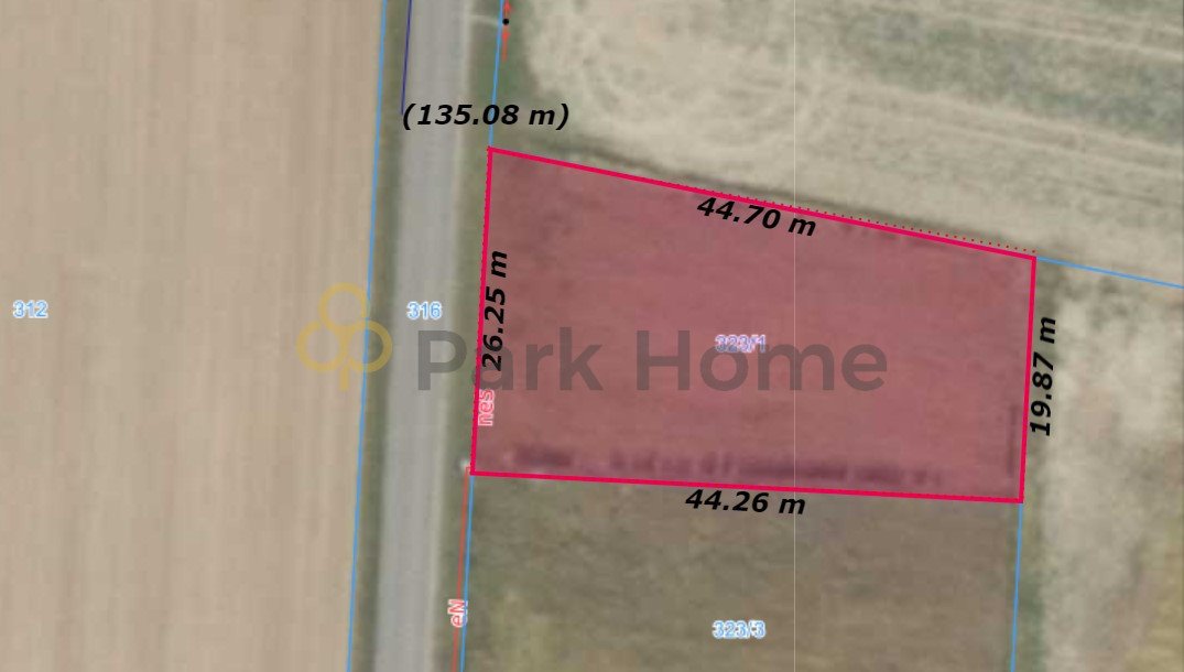 Działka w kształcie delikatnego trapezu o wymiarach 26,25 m x 44,70 m.