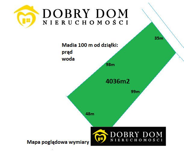 Zapraszam na bezpłatną prezentację kształtnej działki o powierzchni 4036 m2 i wymiarach 35x99x48x98.