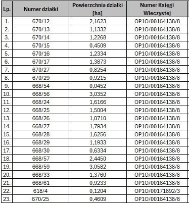 1. W skład mienia objętego aukcją wchodzi nieruchomość gruntowa niezabudowana, położona w województwie opolskim, powiat miasto Opole, jednostka ewidencyjna miasto Opole, obręb ewidencyjny 166101_1.0147, Wrzoski, w mieście Opole, w Podstrefie Opole-Wrzoski Wałbrzyskiej Specjalnej Strefy Ekonomicznej INVEST-PARK, będąca własnością WSSE „INVEST-PARK” sp. z o.o., o powierzchni całkowitej 30,2387 ha, składająca się z działek gruntu o numerach wskazanych poniżej w tabeli, dla której Sąd Rejonowy w Opolu, VI Wydział Ksiąg Wieczystych prowadzi księgi wieczyste o numerach: OP1O/001pokaż telefon oraz OP1O/001pokaż telefon (przy czym działki o numerach 670/25, 670/27, 670/29, 668/54, 668/56, 668/57, 668/59, 668/61 oraz 618/4 powstały w wyniku podziału działek objętych ww. księgami wieczystymi, a ich aktualne numery ewidencyjnie nie zostały jeszcze wpisane do księgi wieczystej), zwana dalej „Nieruchomością”.