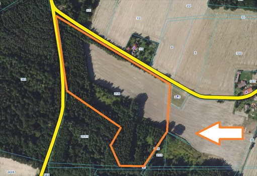 Działka o nieregularnym kształcie wieloboku, posiadająca dostęp do drogi publicznej z dwóch stron. Oznaczenie nieruchomości w ewidencji gruntów i budynków: ŁV ( pow. 0,58 ha), PsIV ( pow. 0,14 ha), PsV ( pow. 1,12 ha), RIIIb ( pow. 1,03 ha), RIVa (pow. 1,25 ha), RIVb ( pow. 1,09 ha), RV( pow. 0,40 ha).