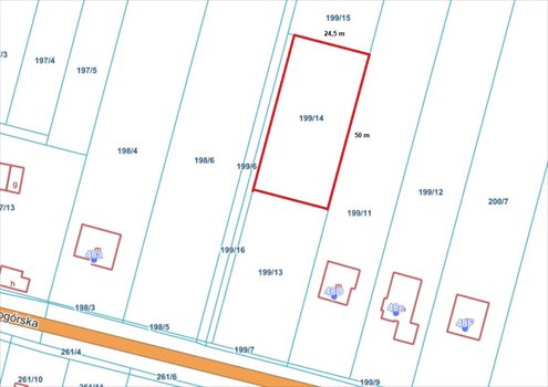 Kształt działki prostokątny o wymiarach dł. 24,50 m szer. 50 m.
