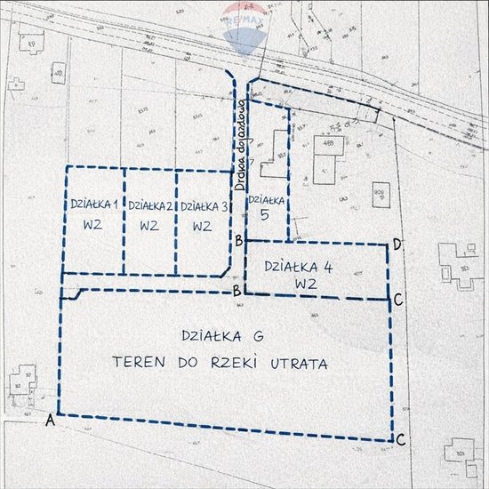 W wyniku podziału dz. ew. 87/6 powstaje łącznie 6 działek: 4 działki o pow. ok. 1200m z WZ, 1 działka zabudowana bud. gospodarczym o pow. ok. 1000m oraz pozostałość wynikająca z podziału całości tj. ok. 3ha.