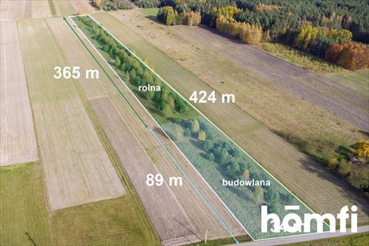 For sale: an agricultural-building plot with issued building conditions. The building area covers 30 ares (0.3 ha). The plot dimensions are 34 meters wide and 423 meters long. This allows for the possibility of creating an access road and dividing the land into smaller plots without losing the proper width for the subdivided lots.