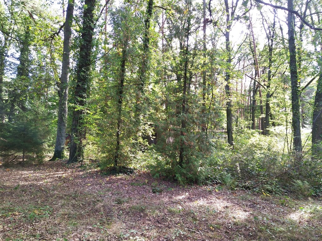 Działka jest ogrodzona siatką, porośnięta drzewami.
