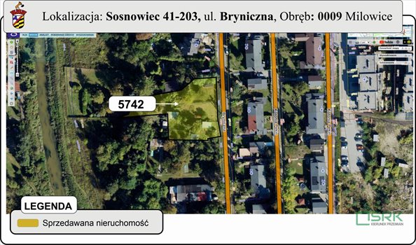 Przedmiotem sprzedaży jest działka o nr ewid. 5742 o powierzchni 1700 m2 (0,1700 ha), zlokalizowana w Sosnowcu, dzielnica Milowice, przy ulicy Brynicznej. Kształt działki jest nieregularny. Nieruchomość ta jest częściowo ogrodzona metalowymi panelami wraz z bramą wjazdową. Na terenie działki znajdują się obecnie ogródki działkowe. Teren nieruchomości częściowo zagospodarowany, porośnięty roślinnością trawiastą i pojedynczymi drzewami. Na działce posadowione są dwie altanki należące do osób trzecich, nie podlegające wycenie. Powierzchnia działki jest płaska. Przez działkę nie przebiega kolidujące uzbrojenie.