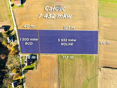 Około 1500 m2 to teren budowlany MN1(szerokość ok. 47 metrów, długość ok. 33 metry)