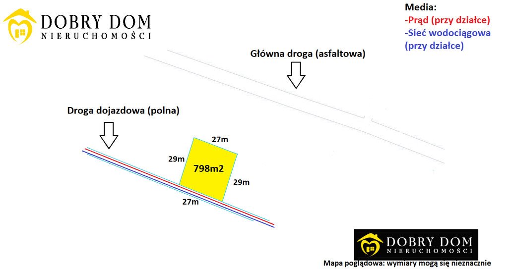 Działka posiada dostęp do mediów, ponieważ prąd i woda znajdują się w drodze przy działce.