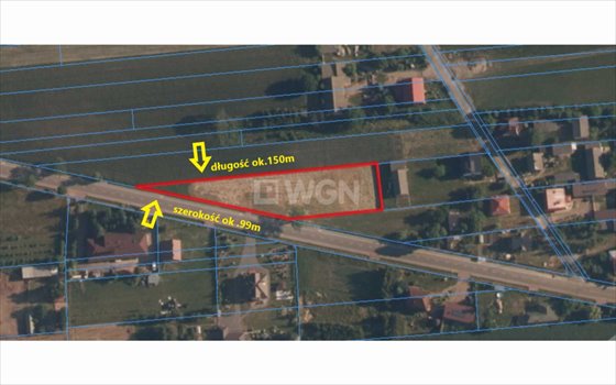 Działka w kształcie trapezu, nieogrodzona,o wymiarach: szerokość od ulicy ok. 99m,