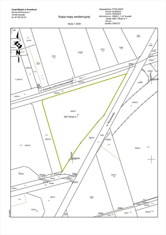 na sprzedaż nieruchomości niezabudowanej, stanowiącej własność Miasta Suwałk oznaczonej działką nr 32662/27 o powierzchni 2,2104 ha, położonej przy ul. Edwarda Lecha Wojczyńskiego w Suwałkach, wchodzącej w skład nieruchomości oznaczonej księgą wieczystą nr SU1S/000pokaż telefon. Na działce znajduje się sieć energetyczna średniego napięcia. Nabywca zobowiązany będzie do nieodpłatnego znoszenia tej sieci oraz nieodpłatnego udostępniania wejścia na grunt w przypadku jej awarii bądź konserwacji. Działka zgodnie z miejscowym planem zagospodarowania przestrzennego rejonu ulicy Raczkowskiej w Suwałkach zatwierdzonym Uchwałą Nr LXI/805/2023 Rady Miejskiej w Suwałkach z dnia 27.09.2023 roku objęta jest konturem 15 KL/I/U - teren komunikacji lotniczej oraz obiektów i usług towarzyszących lotnisku. Ustala się lokalizację zabudowy związanej z funkcjonowaniem lotniska Suwałki, w tym: szkół lotniczych i spadochronowych, zabudowy składowo - magazynowej, parkingów, centrów logistycznych, usług hotelowych i gastronomicznych oraz innych usług wspomagających funkcjonowanie lotniska. Dopuszcza się możliwość realizacji: obiektów i urządzeń małej architektury, budynków i budowli pomocniczych oraz urządzeń służących utrzymaniu porządku. Dodatkowo dopuszcza się lokalizację urządzeń wytwarzających energię z odnawialnych źródeł energii w postaci ogniw fotowoltaicznych, w tym o mocy zainstalowanej większej niż 500 kW, zgodnie z przepisami szczególnymi i o ile nie stoi to w sprzeczności z funkcjonowaniem lotniska. Nieruchomość przeznaczona jest do sprzedaży w drodze przetargu ustnego nieograniczonego.
