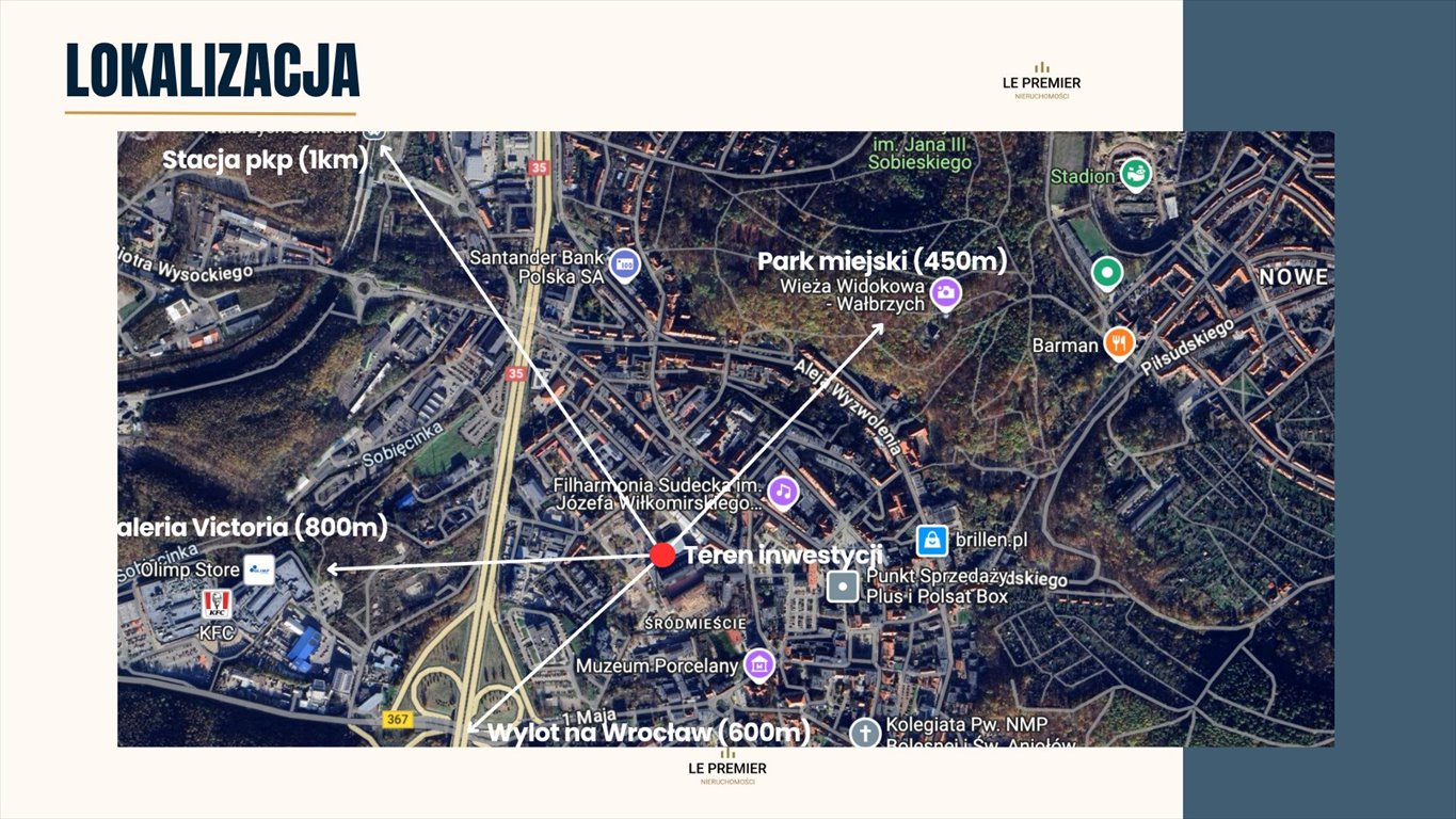 ⸻ Parametry poszczególnych działek Wszystkie działki są w użytkowaniu wieczystym i mają zbliżony metraż. Istniejące budynki są w trakcie rozbiórki (z wyjątkiem zabytkowych). Możliwość zakupu pojedynczych działek lub całego kompleksu. Działka 1 - 16 396 m² • PUM: 10 374 m² • GLA: 7 079,3 m² • Cena: 9 200 000 zł netto Działka 2 - 14 296 m² • PUM: 8 610 m² • GLA: 8 421 m² • Cena: 7 000 000 zł netto Działka 3 - 14 671 m² • PUM: 9 888 m² • GLA: 3 072 m² • Cena: 5 840 000 zł netto ⸻ MPZP pozwala na intensywną zabudowę Tereny oznaczone jako 16/MWU, 17/MWU, 18/MWU w uchwale nr XXXVII/420/21 Rady Miejskiej Wałbrzycha z dnia 17.06.2021 r. Drogi dojazdowe są gminne, utwardzone. W działkach znajdują się wszystkie media miejskie. ⸻ Dlaczego warto? • ścisłe centrum miasta, idealna lokalizacja pod mieszkania i usługi • MPZP z wysokimi parametrami zabudowy • gotowa koncepcja inwestycji z podziałem na działki • możliwość umowy warunkowej (do uzyskania PNB) • pełne uzbrojenie terenu i drogi asfaltowe dookoła • opcja płatności w transzach ⸻ Nie trać czasu - poznaj potencjał tej inwestycji Michał Rorbach tel. 533pokaż telefon You can also contact me in English.