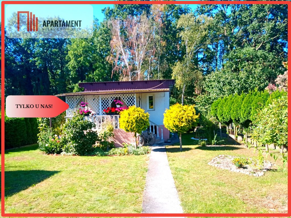 Działka ogrodzona siatką o powierzchni 412 mkw. na której znajduje się murowany, podpiwniczony domek wielkości 36 mkw. wraz z zadaszonym tarasem 10 mkw.