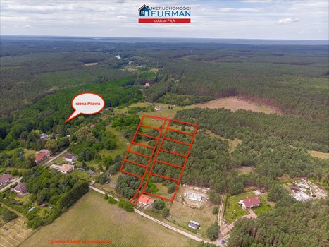 Działki położone w miejscowości otoczonej lasem w pobliżu rzeki Piława, na której urządzane są spływy kajakowe.