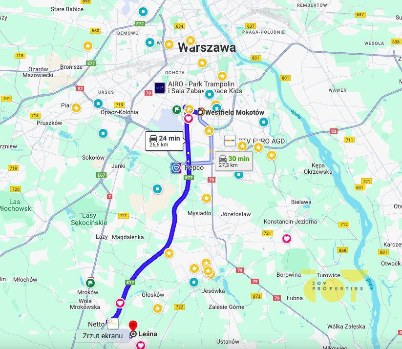 Ciesz się spokojem wiejskiego życia, pozostając w bliskiej odległości od udogodnień i zalet Warszawy. Okolica charakteryzuje się spokojną atmosferą, idealną dla osób szukających schronienia przed zgiełkiem miasta, a jednocześnie z wygodnym dostępem do kawiarni, restauracji, aptek i przychodni oraz pobliskich supermarketów, takich jak BIEDRONKA, NETTO i TOP MARKET. Twoje dzieci mogą bezpiecznie dojechać rowerem do pobliskiej szkoły w ciągu 10 minut, bez stresu podróży samochodem w godzinach szczytu.