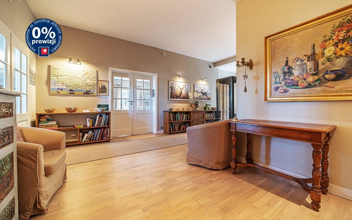 Na parterze znajduje się ze smakiem urządzony obszerny salon kominkowy będący